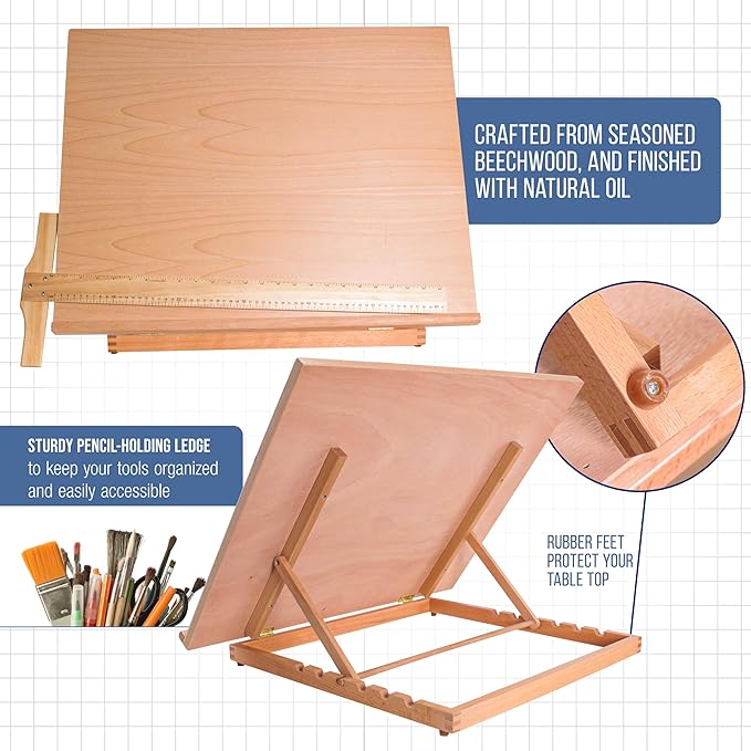 U.S. Art Supply X-Large 26" x 21" Wooden Drawing Board, Adjustable Table Top Easel for Painting and Drawing - Drafting Board with T-Square, Pencil Ledge